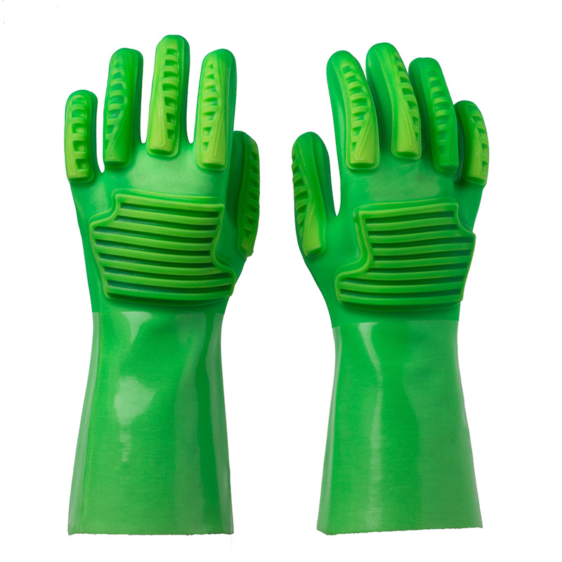 Los guantes recubiertos de PVC anti-impacto con respaldo de caucho termoplástico (TPR) protegen las manos y los dedos de golpes y golpes, y el color verde hi-viz aumenta la conciencia de los trabajadores sobre la colocación de las manos. Los guantes recubiertos anti-impactoPVC de protección química resisten una amplia variedad de productos químicos y disolventes y tienen clasificación ASTM ANSI contra pinchazos y peligros de corte. De forma ergonómica para reducir la fatiga de las manos, los puños de guantelete proporcionan una cobertura adicional.