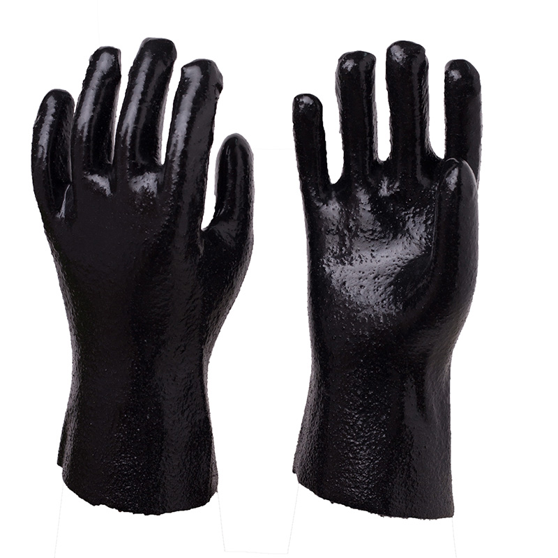 Black PVC coated gloves.Men's size Large. 12" length. Gauntlet cuff. Fully coated, single dipped, semi-rough finish. Interlock lined. Chemical resistant.